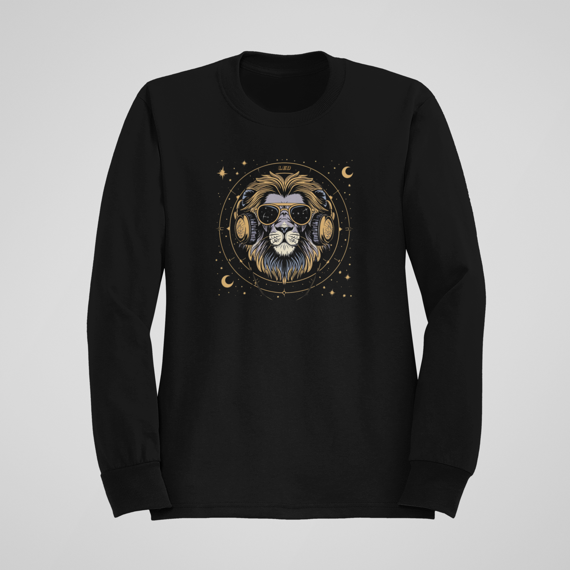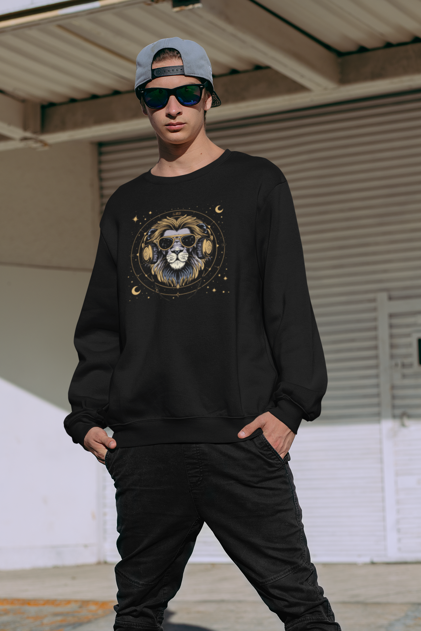 Džemperis „DJ Leo“ – tai išraiškingas juodos spalvos laisvalaikio drabužis su liūto iliustracija.