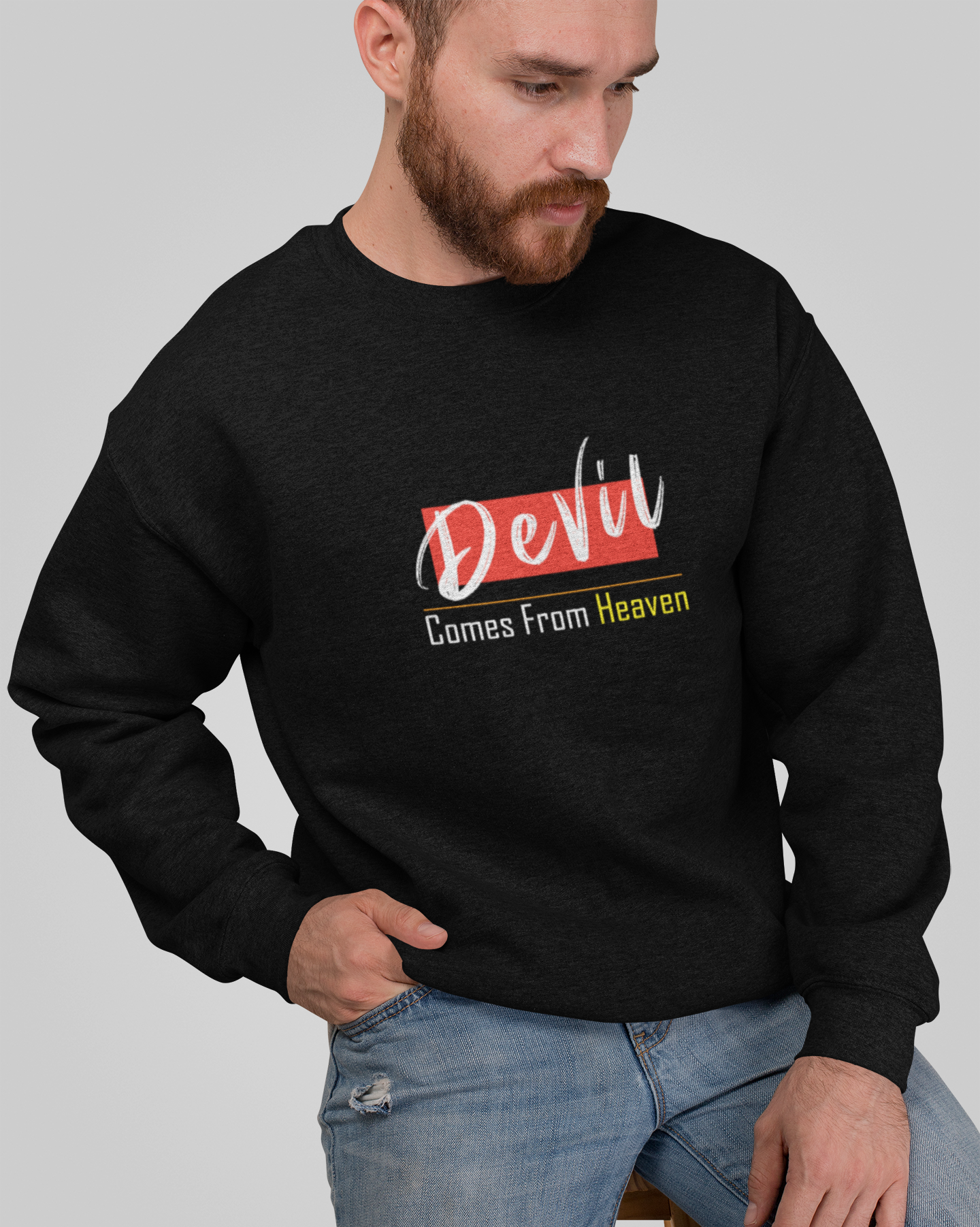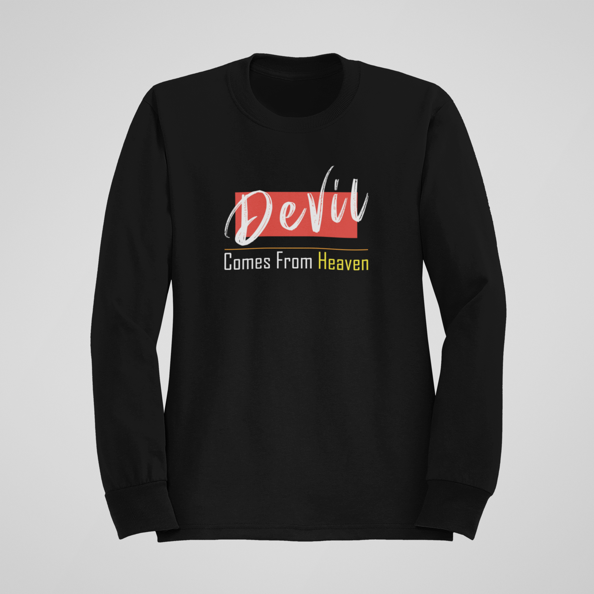 Šis džemperis su išraiškingu užrašu „Devil Comes From Heaven“ – puikus pasirinkimas tiems, kurie vertina stilių, ironiją ir patogumą.
